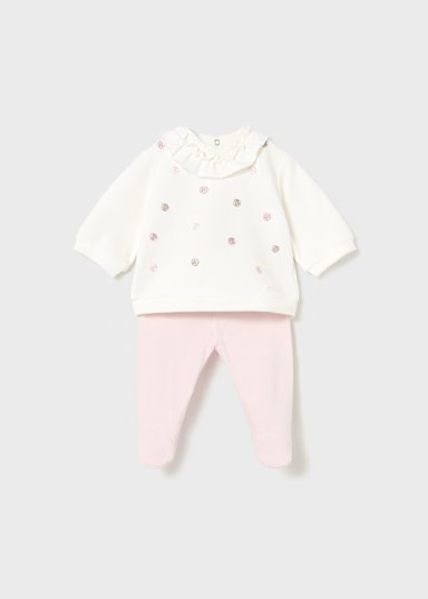 Conjunto tricot de dos piezas para recién nacido que combina comodidad y estilo. La sudadera de manga larga presenta cierre con botones a presión en la espalda y está confeccionada en suave algodón elástico con detalles bordados. El pantalón tipo pijama cuenta con cinturilla extensible que se adapta al crecimiento del bebé, bajo elástico y pies integrados para mayor ajuste y calidez. Elaborado con algodón Better Cotton, apoyando prácticas sostenibles en la producción textil. Ideal para el día a día del recién nacido.