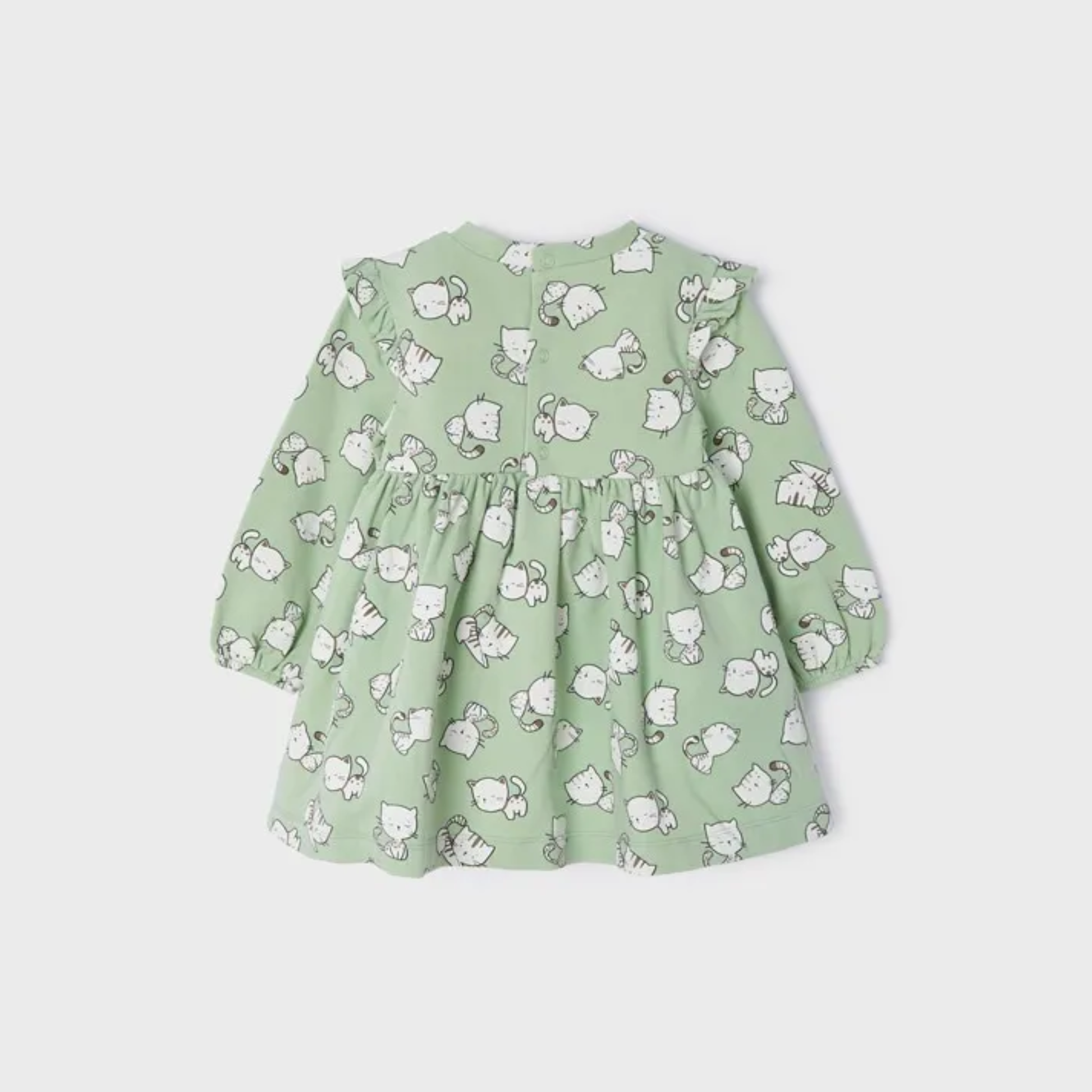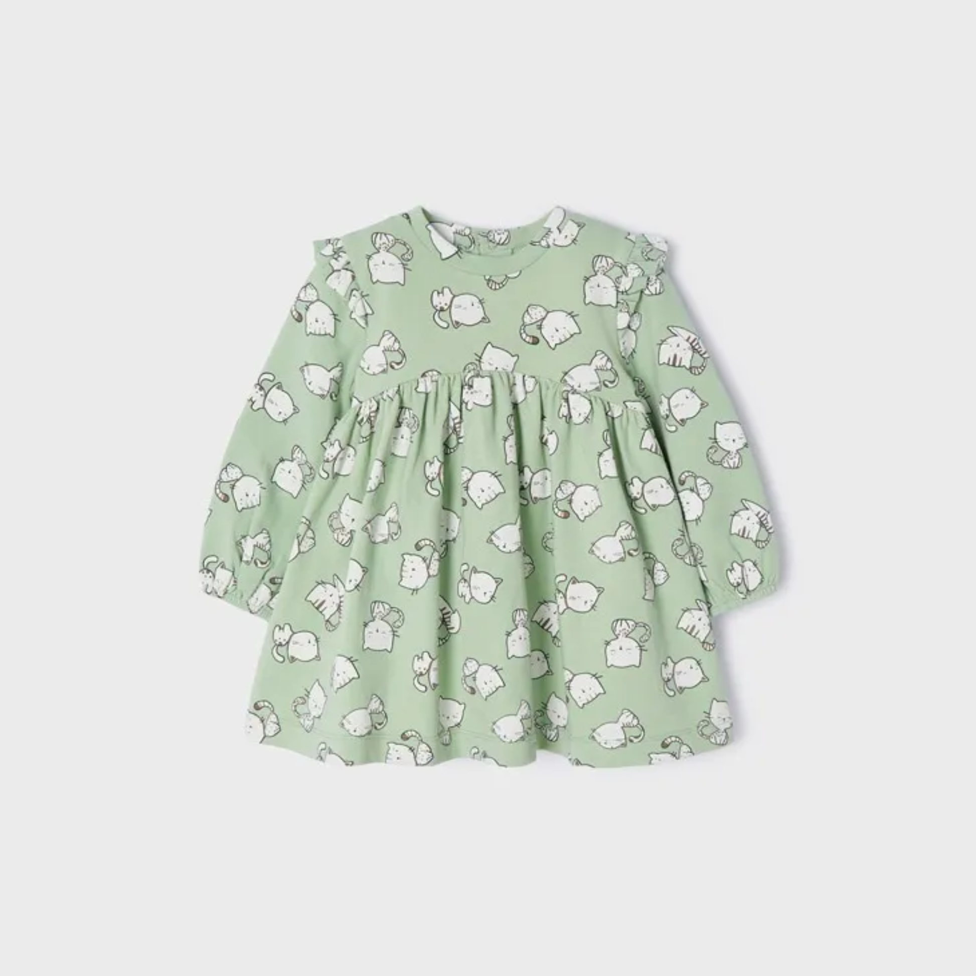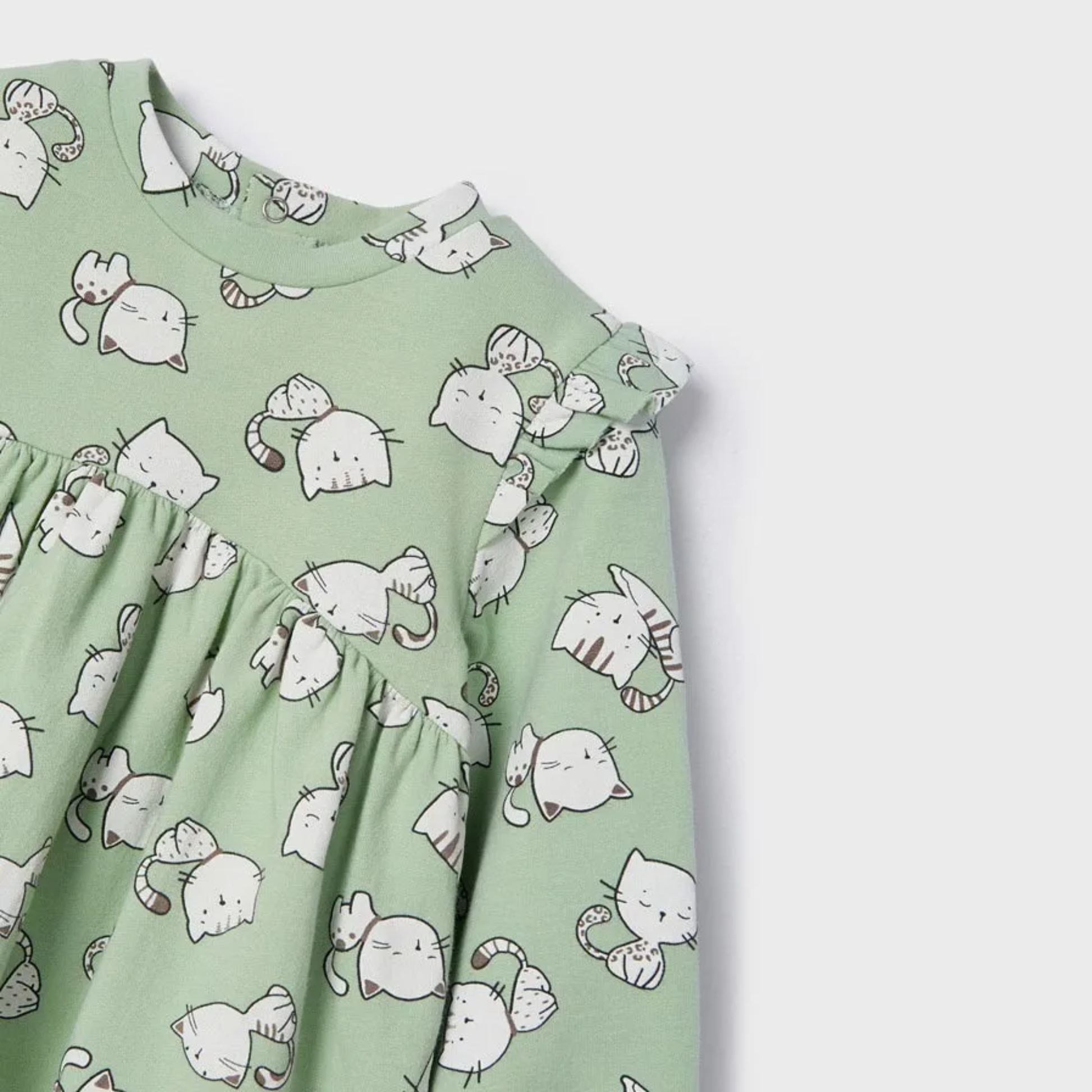 Este vestido de manga larga para niña combina comodidad y estilo con un estampado divertido de gatos en tonos verdes. Ideal para el invierno, ofrece calidez sin sacrificar la frescura del diseño. Perfecto para mantener a las pequeñas abrigadas y con un look encantador en cualquier ocasión casual o familiar.