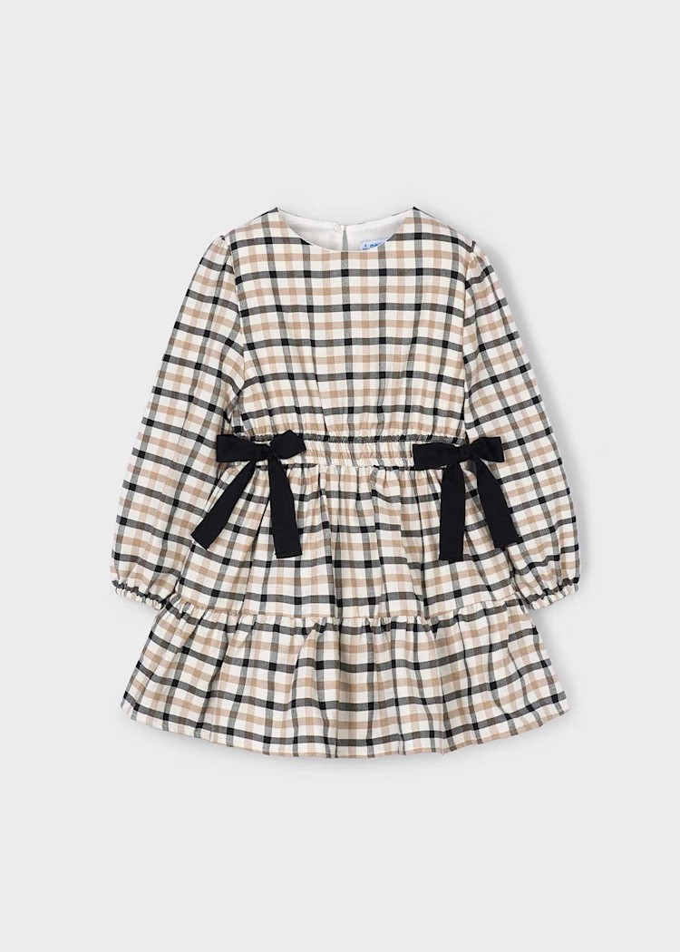 Vestido de manga larga confeccionado en suave tejido de viella que proporciona calidez y confort durante todo el día. Diseño versátil con cinturilla elástica ajustable que se adapta perfectamente al cuerpo de la niña. Presenta detalles fruncidos estratégicamente distribuidos y un elegante moño como elemento decorativo principal. El motivo de cuadros clásico añade sofisticación al diseño. Incluye forro interior que mejora la durabilidad y comodidad. Elaborado con algodón Better Cotton, apoyando prácticas sostenibles en la producción textil. Una prenda versátil ideal para el guardarropa de cualquier niña.